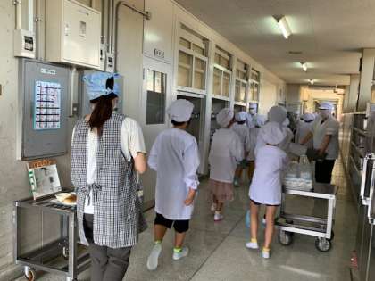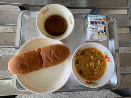 本日のメニューは「サンラータン・照り焼きハンバーグ・コッペパン・牛乳」でした。