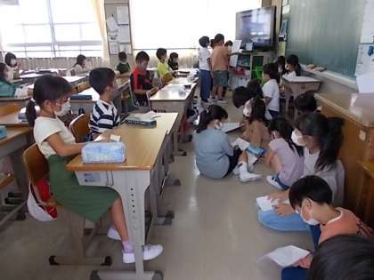 神石小学校との交流会 3年2組 公開日 2022/09/20 更新日 2022/09/20 3年 2組の様子です。今回は,大仙小学校の3年生が,学んだ内容を神石小学校の子どもたちに聞いてもらっての交流でした。子どもたちは,仁徳天皇陵古墳についてや,大仙のまちの施設についてなど,それぞれが興味関心を持って調べたことを,上手に伝えることができました。