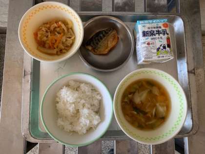 10月14日金曜日 今日の給食 本日のメニューは「五目汁・さばのりきゅう焼き・切り干し大根の煮物・ごはん・牛乳」でした。