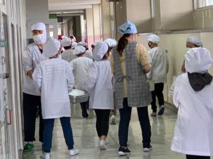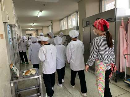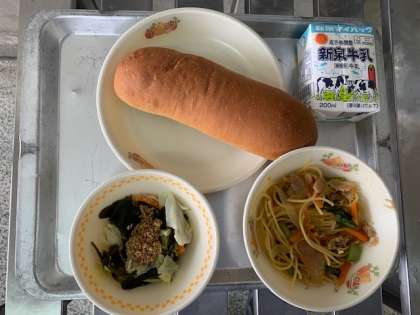 本日のメニューは「じゃこと小松菜のスパゲティ・わかめサラダ・黒糖パン・牛乳」でした。