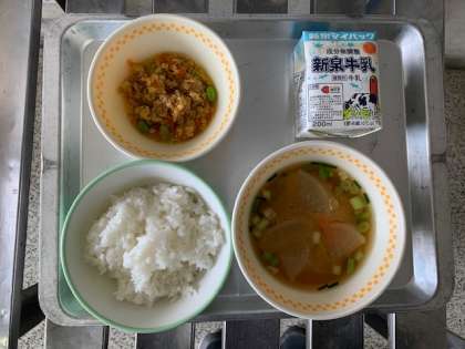 10月18日火曜日 今日の給食 本日のメニューは「さつま汁・そぼろ丼・牛乳」でした。