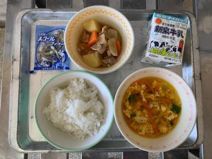 10月20日木曜日 今日の給食 本日のメニューは「四川風スープ・中華風肉じゃが・ミニフィッシュ・ごはん・牛乳」でした。