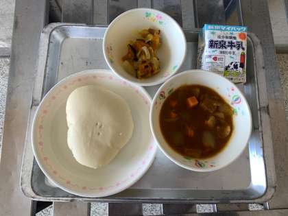 本日のメニューは「ポークカレーシチュー・かぼちゃのチーズ焼き・オリーブパン・牛乳」でした。