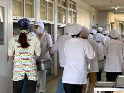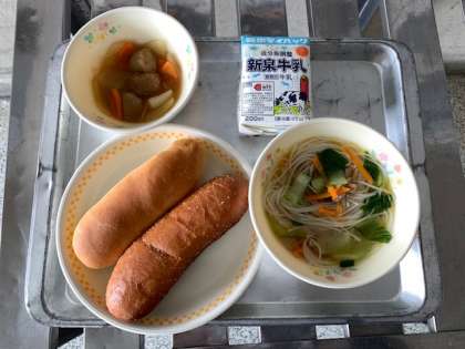 11月4日金曜日 今日の給食 本日のメニューは「ビーフンスープ・肉団子の甘酢煮・ミニパン・あげパン・牛乳」でした。