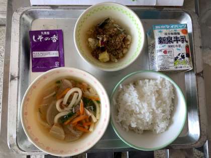 11月8日火曜日 今日の給食 本日のメニューは「はりはりうどん・ひみこスナック・ふりかけ・ごはん・牛乳」でした。