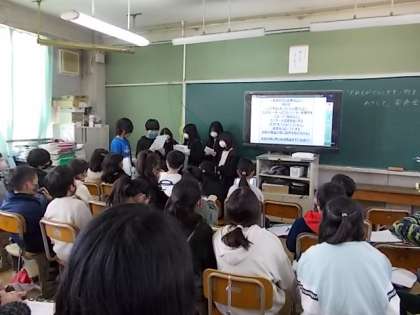 オープンスクール 4年生 公開日 2023/02/17 更新日 2023/02/17 4年 4年生は、2学期から総合的な学習の時間に「だれもがくらしやすい町をめざして」をテーマに、福祉の視点で学習を進めてきました。今日はテーマ別にグループ単位で調べたこと、体験したことを発表しました。