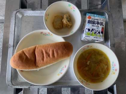 2月20日月曜日 今日の給食 本日のメニューは「野菜スープ・白身魚のレモン風味・コッペパン・牛乳」でした。