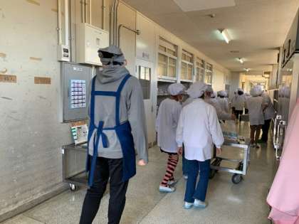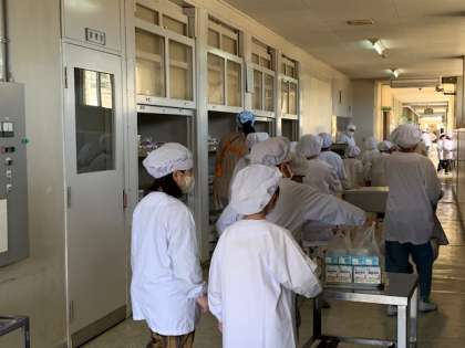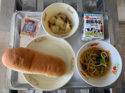 本日のメニューは「じゃこと小松菜のスパゲティ・じゃがベーコン・いちごジャム・コッペパン・牛乳」でした。