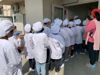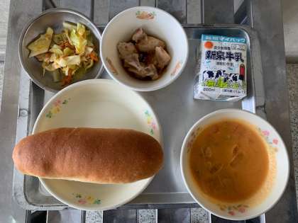 本日のメニューは「にんじんの豆乳ポタージュ・鶏肉のバーベキューソース・キャベツのソテー・コッペパン・牛乳」でした。