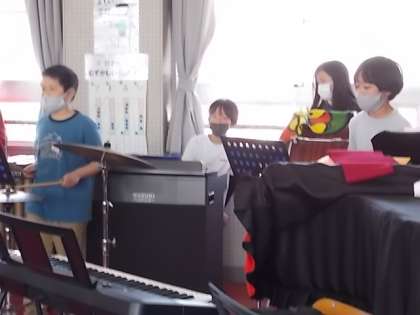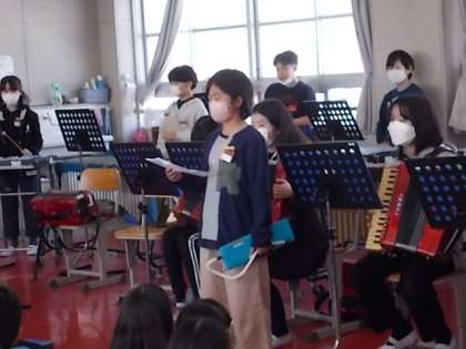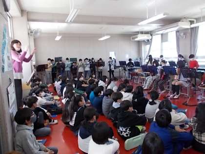 今日の3時間目、5年生1組、2組、3組が音楽室に集まり、音楽発表会を行いました。