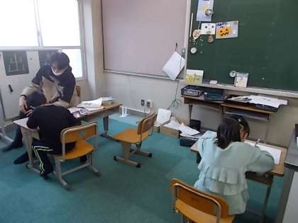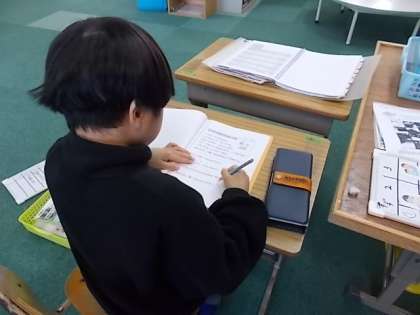 1年生は漢字を、3年生は小数の計算問題を。今日も、がんばってます!
