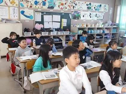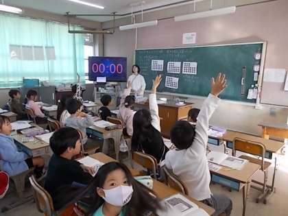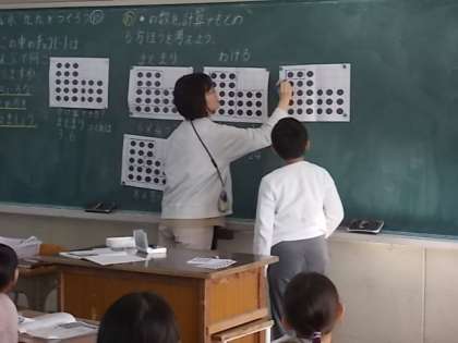 黒板には不規則に並んだドット。これをまとまりを作って九九をつくります。