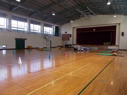 体育館にはたくさんの跳び箱とコーンが。今日は跳び箱を使った運動あそびだったようです。