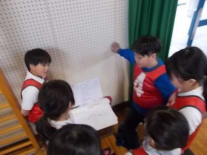 グループごとにストーリーの書かれたプリントに集まり、動きの再確認をしています。