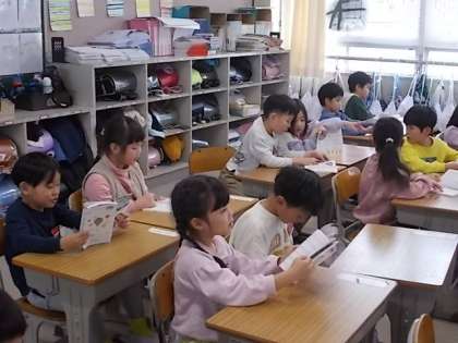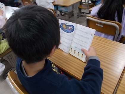 1年1組は歌の本を取り出して、みんなで歌を歌っていました。
