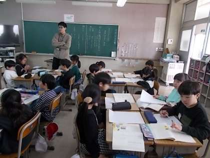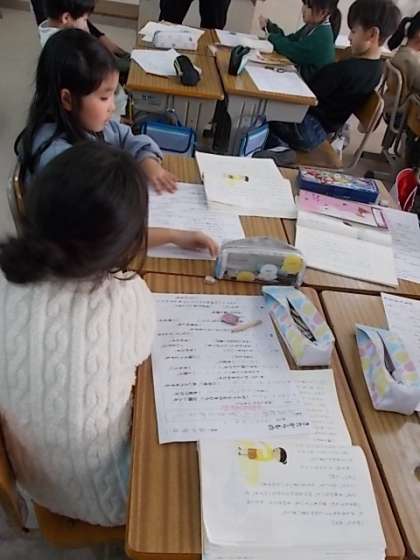 段落ごとにまとめてあるプリントには、所々に空欄があります。今日はグループのみんなで空欄を埋めながらお話を要約していました。