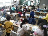 2月の学習参観で発表する「たぬきのいとぐるま」の練習を学年でしていました。