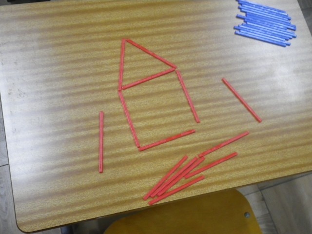 数え棒を使って、いろいろな形を作っています。ただ形を作ればいいのではなく、いろいろな形を組み合わせて作ることが大切です。