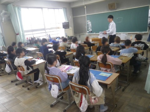新年度は配布物がたくさんあります。子どもたちは先生の話をよく聞いて、配布物を受け取っていました。