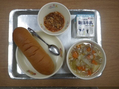 今日の献立:黒糖パン・牛乳・ポトフ・ハンバーグきのこソース