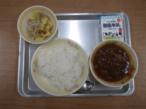 今日の献立:ご飯・牛乳・ハヤシライス・えのきベーコン
