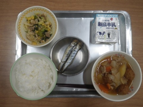 今日の献立:ご飯・牛乳・豚肉と野菜の生姜煮・小松菜と白菜の炒め煮・焼きししゃも
