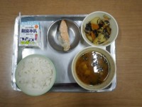 今日の献立:ご飯・牛乳・月見汁・鮭のキノコソースかけ・みたらし団子
