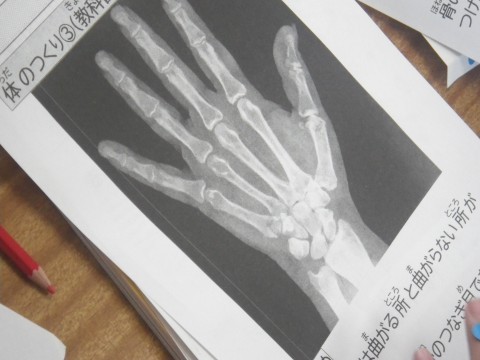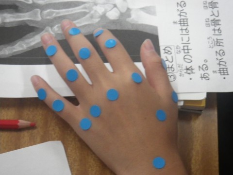 理科,骨と筋肉の学習をしていました。手の曲がるところにシールを貼っていました。