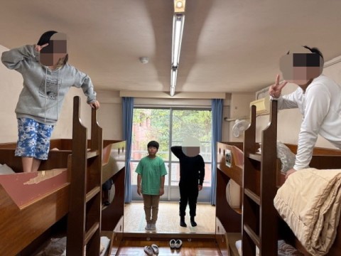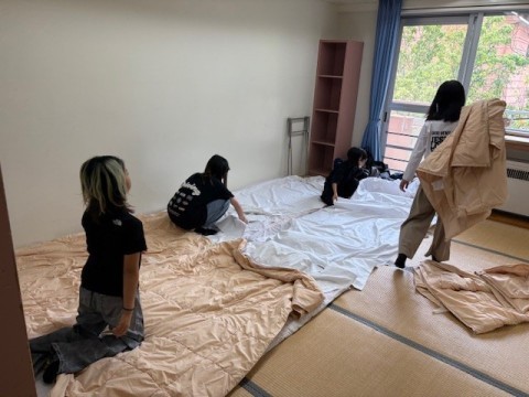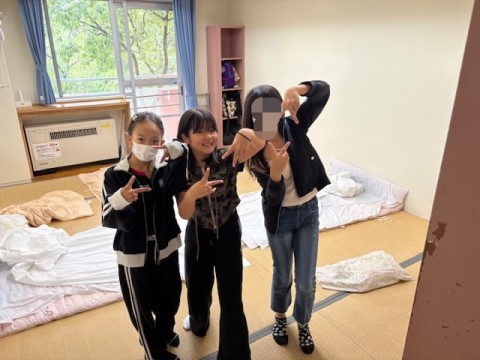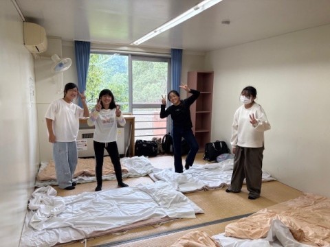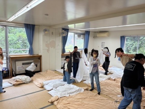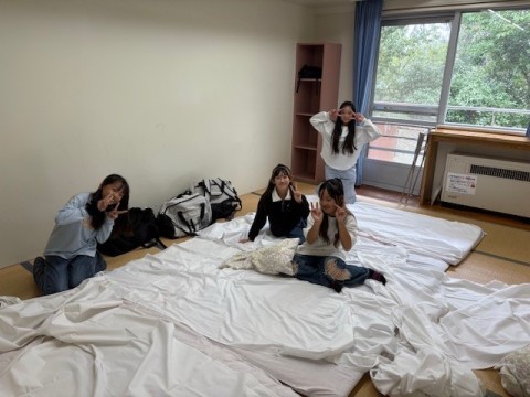 部屋でふとんの準備をしたり,寝る場所を決めたりしてゆっくり過ごしているところです。