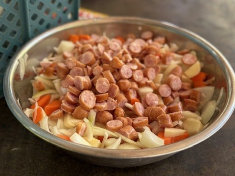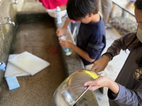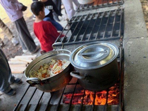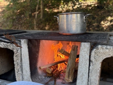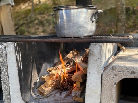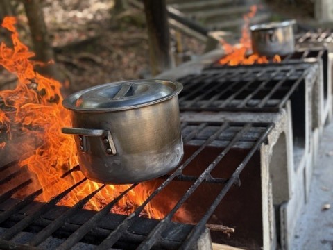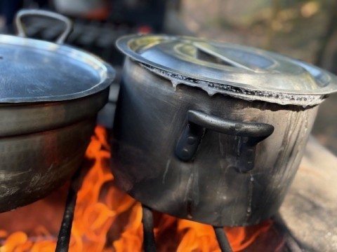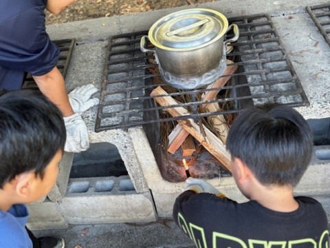 カレー作りも最終段階に入ってきています。かまどで飯盒とカレーを火にかけます。