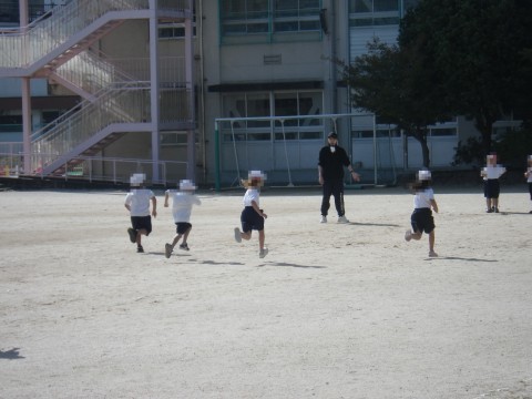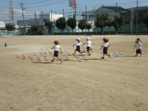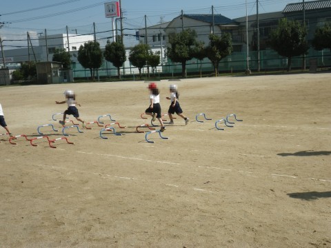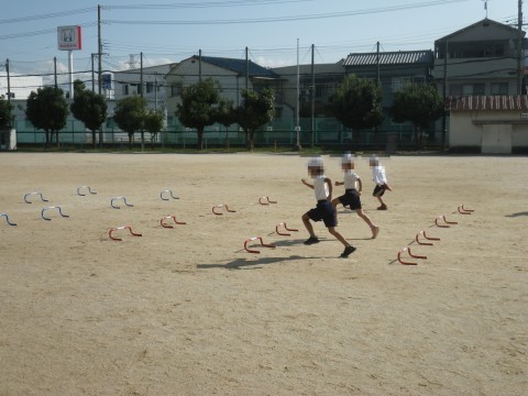 1組も2組も体育では,走の運動をしていました。はやく走るためにはどうすれば良いのか考えて走っていました。ミニハードルも使っていました。