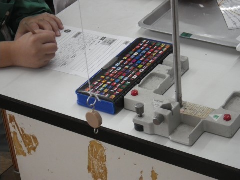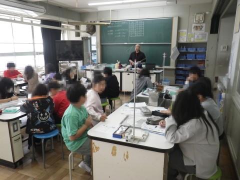 1組は理科,ふりこの学習をしていました。ふりこのふれ幅を変えると,1往復する時間は変わるかどうかを実験で調べていました。