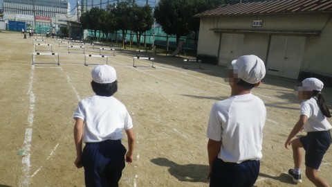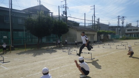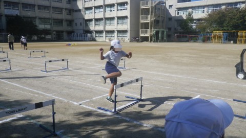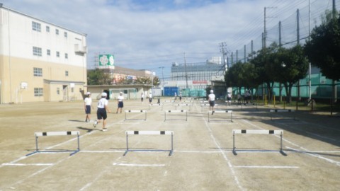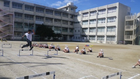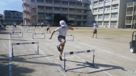 ハードルをテンポよく跳ぶためにはどうしたらよいか考えながら学習を進めています。先生の跳び方も参考にしています。