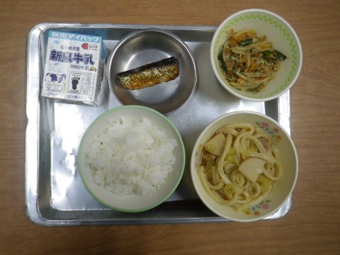 今日の献立:ご飯・牛乳・鳥南蛮うどん・もやしのゴマ風味・イワシのみりん干し