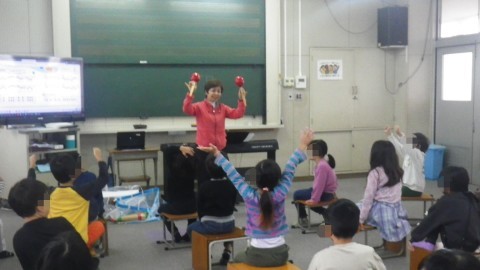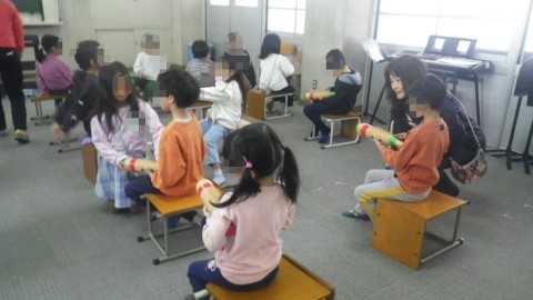「こいぬのマーチ」を鍵盤ハーモニカやギロ、マラカスなどの楽器を使って演奏しています。