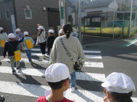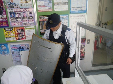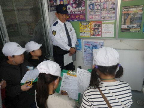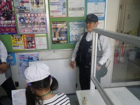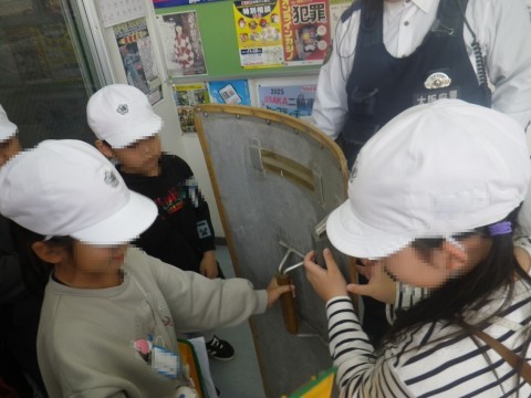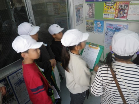 せいかつ科で,グループに分かれて町たんけんに行きました。保護者の方にもご協力いただきました。霞ヶ丘交番では,交番勤務の仕事内容を教えていただいたり,質問に答えていただきました。普段目にすることがない警棒や防護盾を見せていただきました。防護盾は実際に持たせていただき,子どもたちは重さに驚いていました。