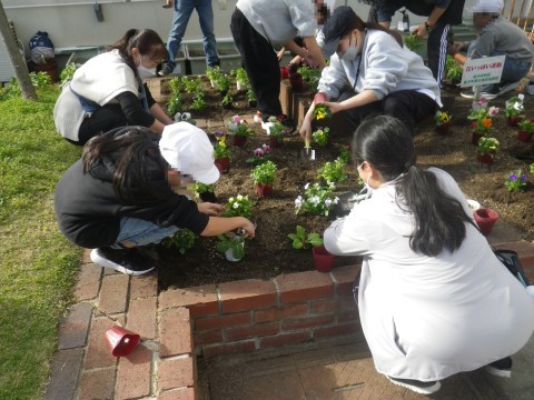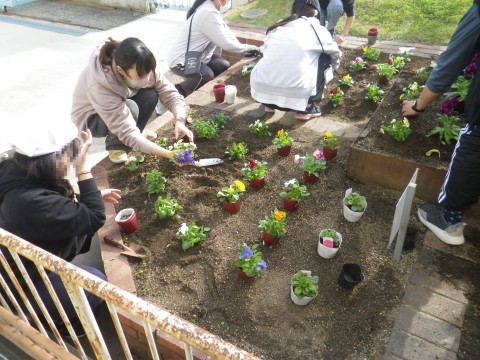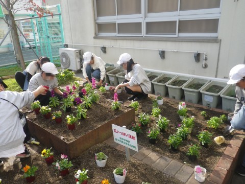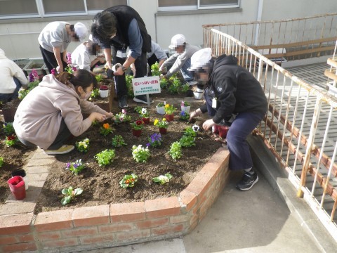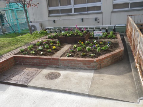 花ボランテイアの方と一緒に美化委員会の6年生が校門横の花壇に花を植えました。きれいな花が登下校の子どもたちを迎え,送ります。