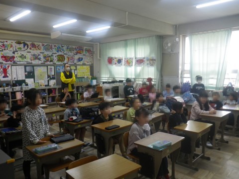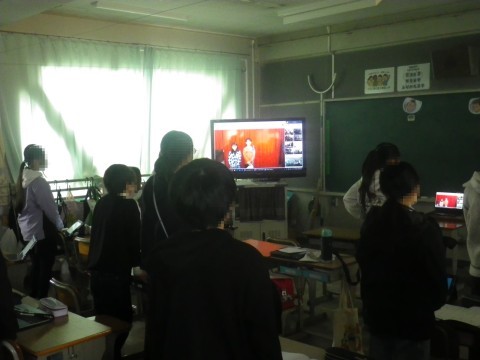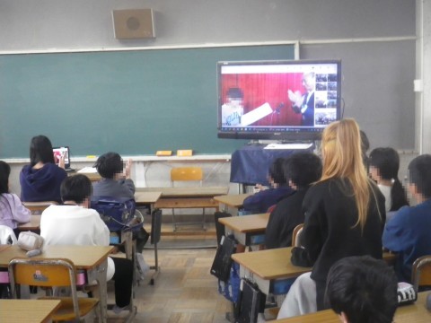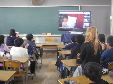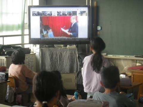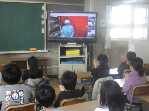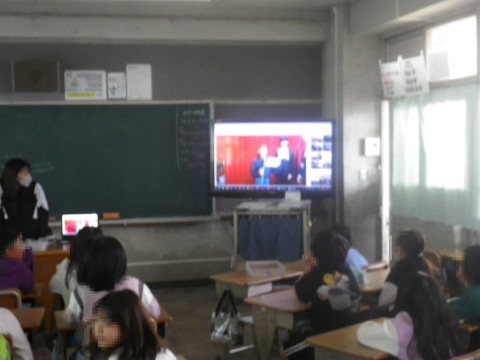 今日はテレビ朝会でした。司会は代表委員会の児童が行います。朝のあいさつをした後,校歌(1番)を歌います。その後,子どもたちの表彰が3件ありました。代表児童は放送室で直接校長が表彰しますが,それ以外の子どもたちは名前を放送で呼ばれたら教室で返事をして立ちます。今日の表彰は,はとぶえ,読書感想文コンクール,堺市幼小中絵画展でした。