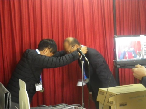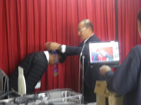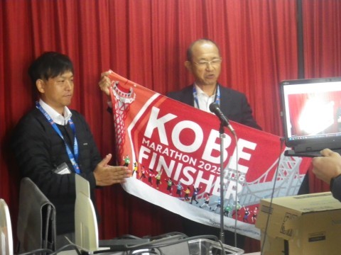 最後は,日曜日の神戸マラソンの表彰です。今年は,校長,教頭が参加し,無事完走しました。校長,教頭が互いに完走メダルをかけ合い,健闘を讃えました。