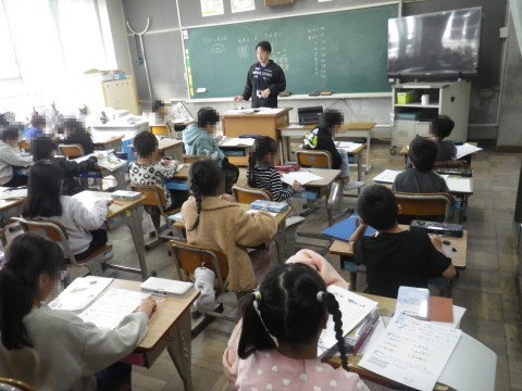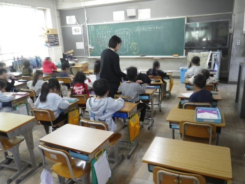 1組は算数,かけ算九九のプリントの答え合わせをしていました。