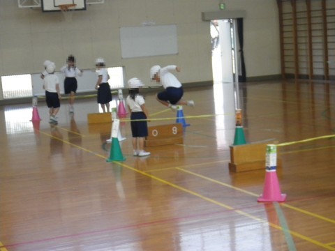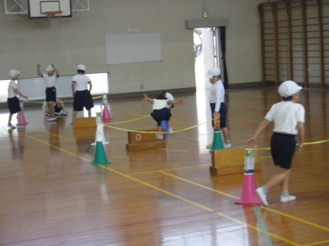 2組は体育,パイナップルジャンプに,新しい障害物が入りました。