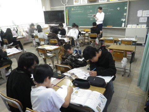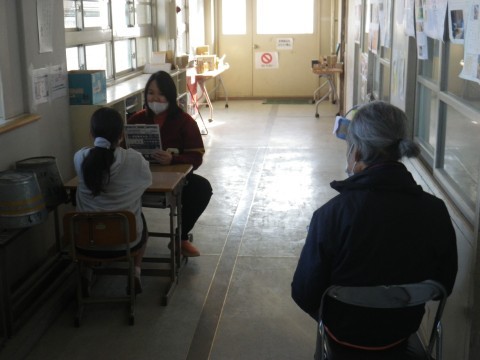 2組は外国語,廊下でヒアリングテストを行っていました。
