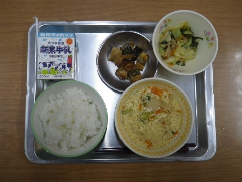 今日の献立:ご飯・牛乳・むらくも汁・サバのゴマ味噌焼き・キャベツと小松菜の炒め煮