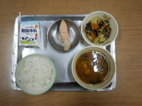 今日の献立:ご飯・牛乳・赤だし・焼き鮭・じゃがいものいそ煮