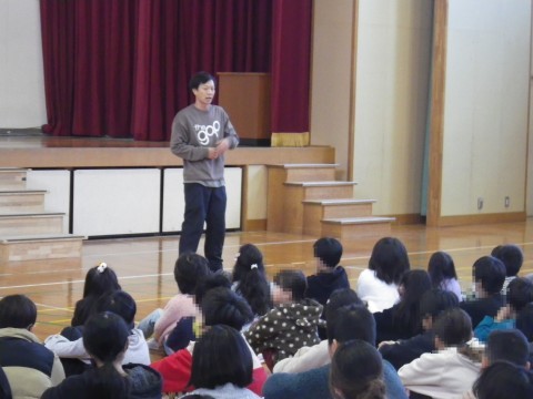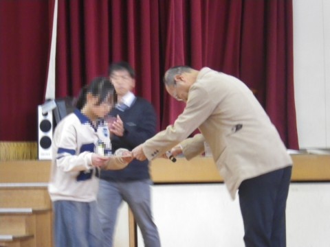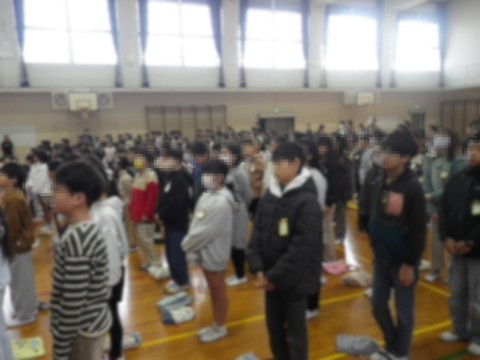 校歌の2番を歌った後,子ども会のソフトボールの表彰がありました。そして,各クラスの代表が12月の学級の目標を発表しました。次に,生徒指導担当の先生から学校生活での注意事項を聞きました。最後に校長が赤い羽根の共同募金のお礼と香港のマンション火災とインドネシアの豪雨災害の話をした後,交通事故や自然災害などを想定し,「危ないことはしない」「自分の命は自分で守る」ということについて話しました。子どもたちは真剣に聞いていました。