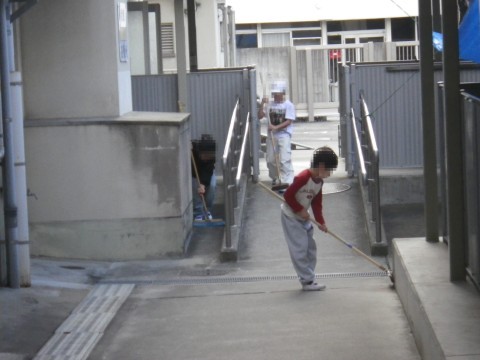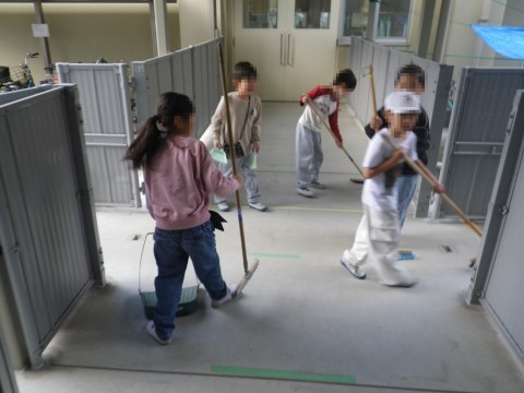クラスのめあてを達成するため,休み時間に清掃をしている子どもがいました。