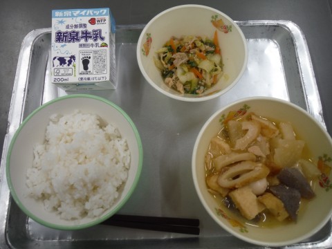 今日の献立:ご飯・牛乳・味噌おでん・大阪しろなと豚肉の煮びたし