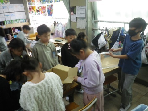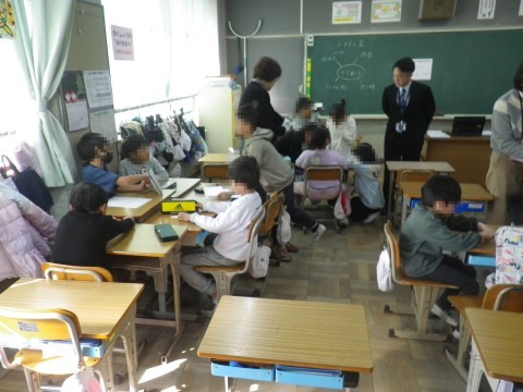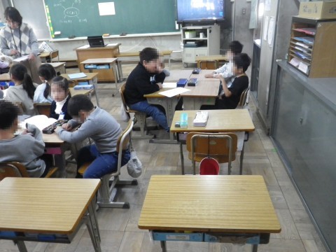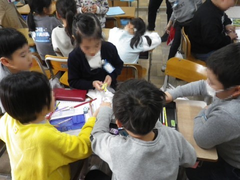 学級会では,みんなが笑顔になるスマイル会を開くために,班ごとに話し合っていました。