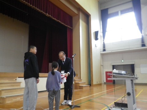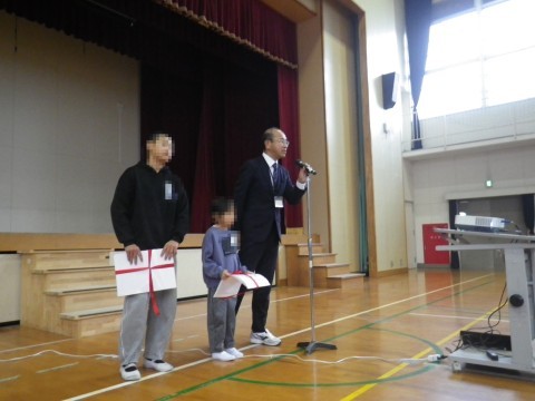 今日は2学期の終業式でした。全員で校歌を歌った後,2年生の代表児童が2学期頑張ったことについて話しました。その後,1年生と6年生の代表児童に2学期のあゆみを渡しました。全校児童は,担任の先生からあゆみをもらいます。