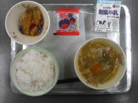 今日の献立:ご飯・牛乳・豚汁・イワシのかば焼き風・ふくまめ